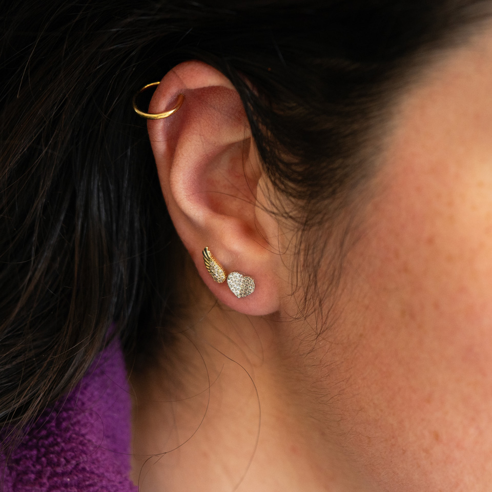 Denne labret med indvendigt gevind har form som en englevinge og kan prale af mange flotte sten. Det smukke, detaljerede design gør smykket til det perfekte blikfang. Det fås i 3 farver: guld, sølv og rødguld. Guldvarianterne er belagt med 14k guld, og sølvvarianten er belagt med rhodium. Labretten har en trådtykkelse på 1,2 mm og fås i længderne 6 mm og 8 mm, hvilket gør smykket velegnet til de fleste ørepiercinger og læbepiercinger.