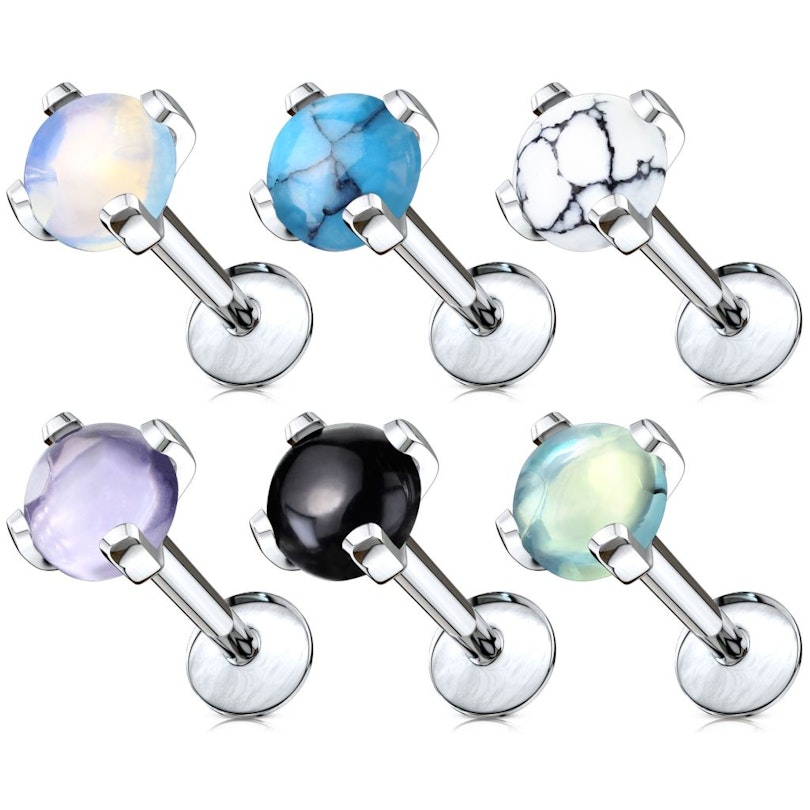 Denne labret fås med forskellige sten, grøn jade eller hvid howlit. Dens længde på 6 mm gør den perfekt til læbepiercinger og mange ørepiercinger.