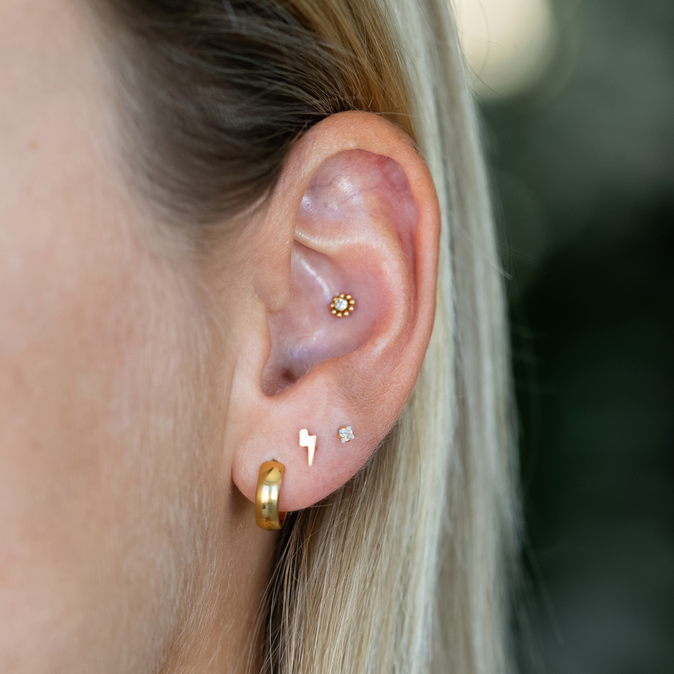 Placering: Tragus, Spiderbite, Snakebite, Medusa, Madonna, Lower labret, Øreflip, Helix, Conch, Forward helix, Angelbite