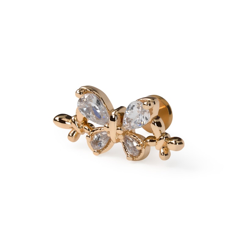 En labret med tre sommerfugle, der leger med detaljerne. I midten sidder en større sommerfugl af klare, tandsatte sten, og to mindre guldfarvede sommerfugle sværmer på hver sin side. En fin trio med masser af personlighed.