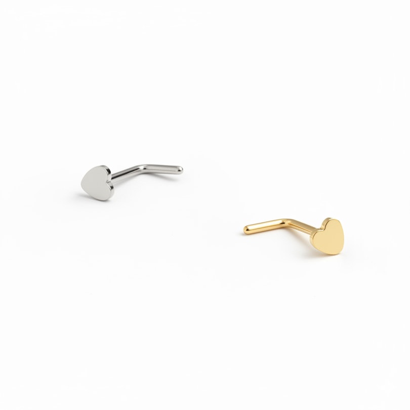 Denne hjerteformede stud er designet til næsefløjspiercinger og gør sit stille indtryk, men går aldrig ubemærket hen. Fås i farven guld eller sølv.