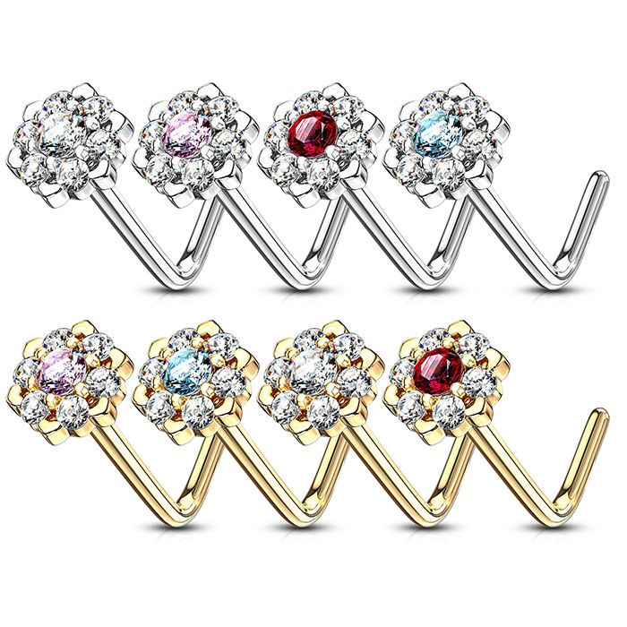 Smykket du er klikket ind på er en næsepiercing, der er lavet af 14 karat guld. På fronten af smykket sidder der en flot og funklende blomst, der er lavet af små klare sten. Eller rettere sagt, så sidder stenene på en front, der er formet som en blomst - stenene sidder fast ved hjælp af de små pinde, der stikker op mellem hver af stenene. Staven på smykket er udstyret med en lille vinkel, som gør, at den vil sidde godt fast i din næse og ikke falde ud.
