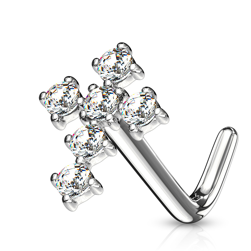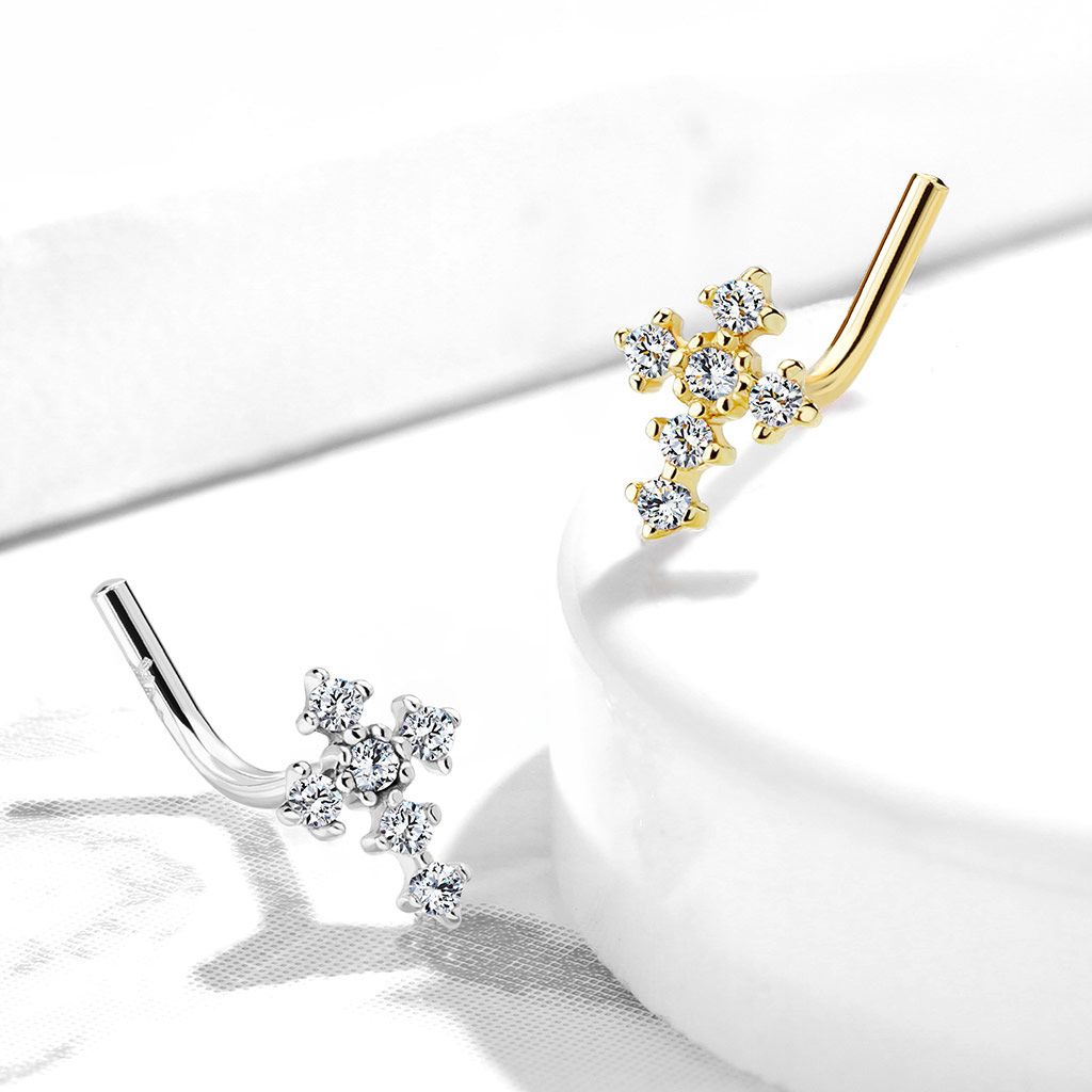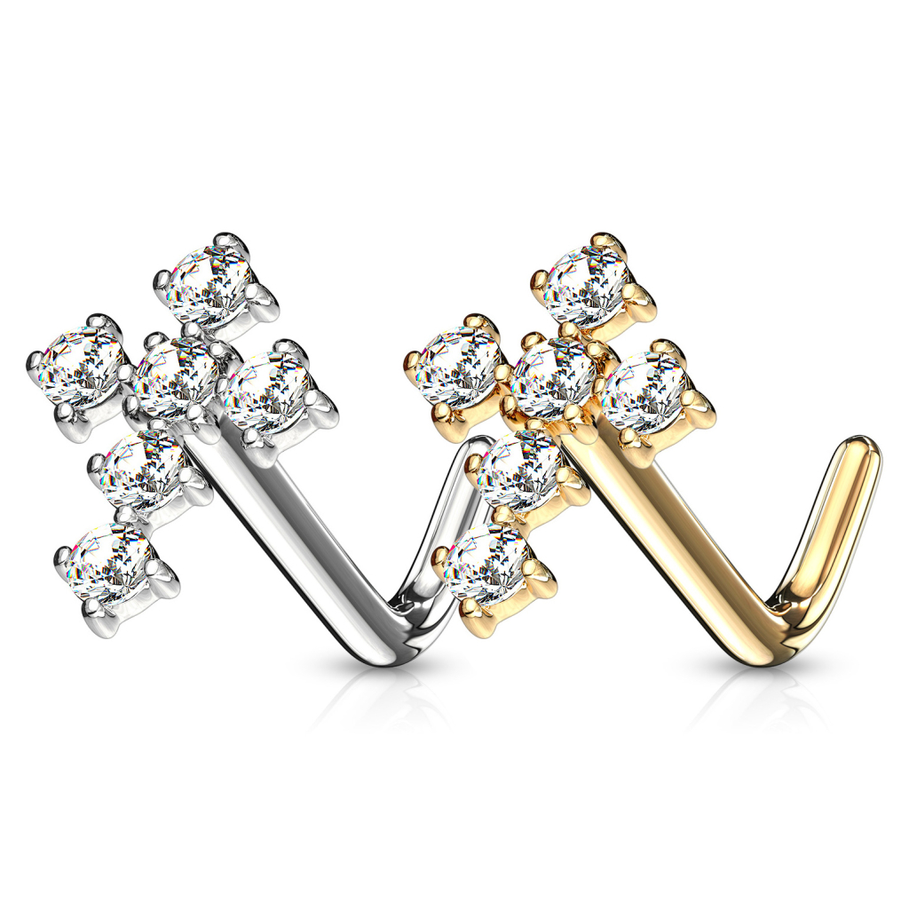 Denne næsepiercing er noget spektakulært. Lige fra den flotte farve på staven til det funklende og iøjnefaldende kors på fronten - det hele spiller bare. Dette er ikke bare en smuk næsepiercing, den er også lavet af 14 karat guld, et eksklusivt materiale. Du kan få smykket i den klassiske 14 karat guld, men også i elegant 14 karat hvidguld. Smykket er udstyret med et lille knæk på 90 grader, hvilket er en fordel når du har smykket i. Knækket sikrer nemlig at smykket ikke falder ud samtidigt med, at det er lidt mere behageligt, at sætte smykket i med.