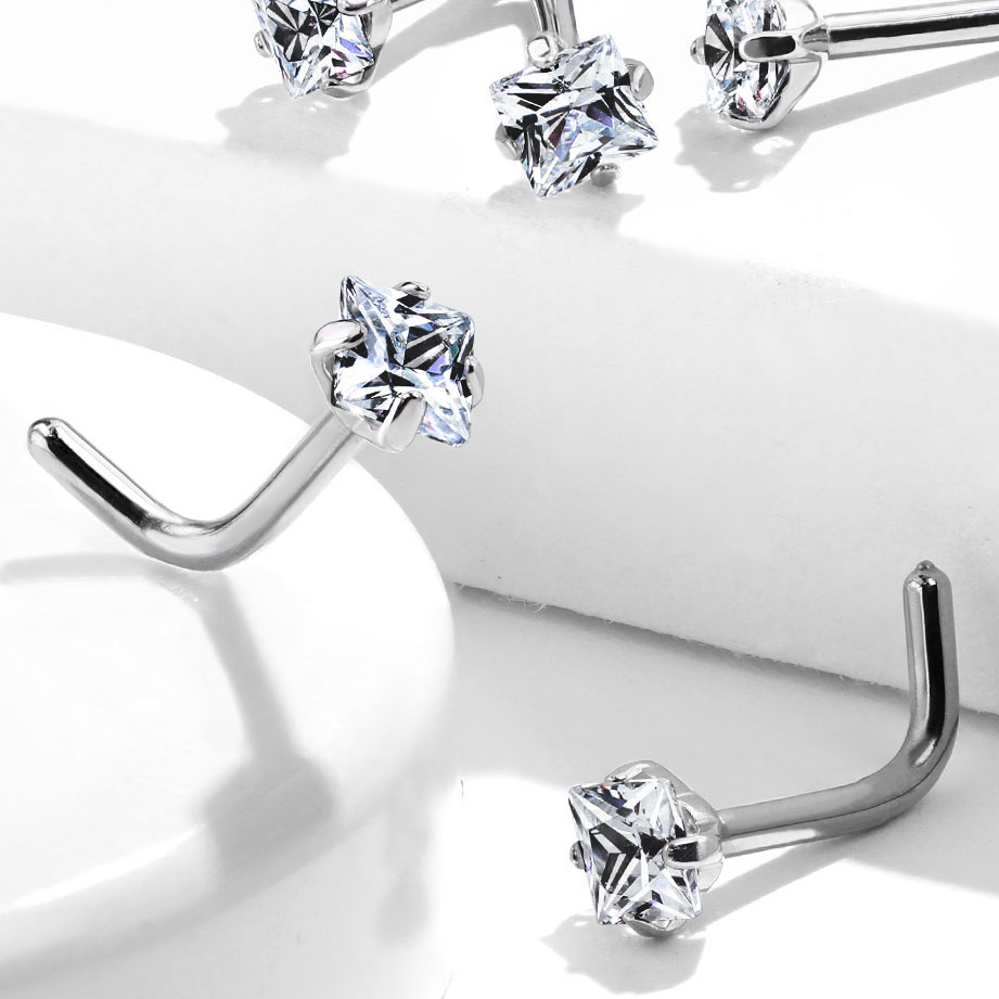 Men nu skal du aldrig opleve dette igen, du kigger nemlig på en næsepiercing, hvor du kan vælge mellem flere forskellige trådtykkelser, blandt andet 0,8 mm. og 1 mm. Du kan også vælge mellem flere stendesigns på din nye næsepiercing, f.eks. så kan du vælge en trekantet klar sten. Smykket er lavet af titanium, hvilket egner sig utroligt godt til nye piercinger, fordi materialet kan laves så rent - derved undgår du også betændelse og andre grumme ting i din piercing.