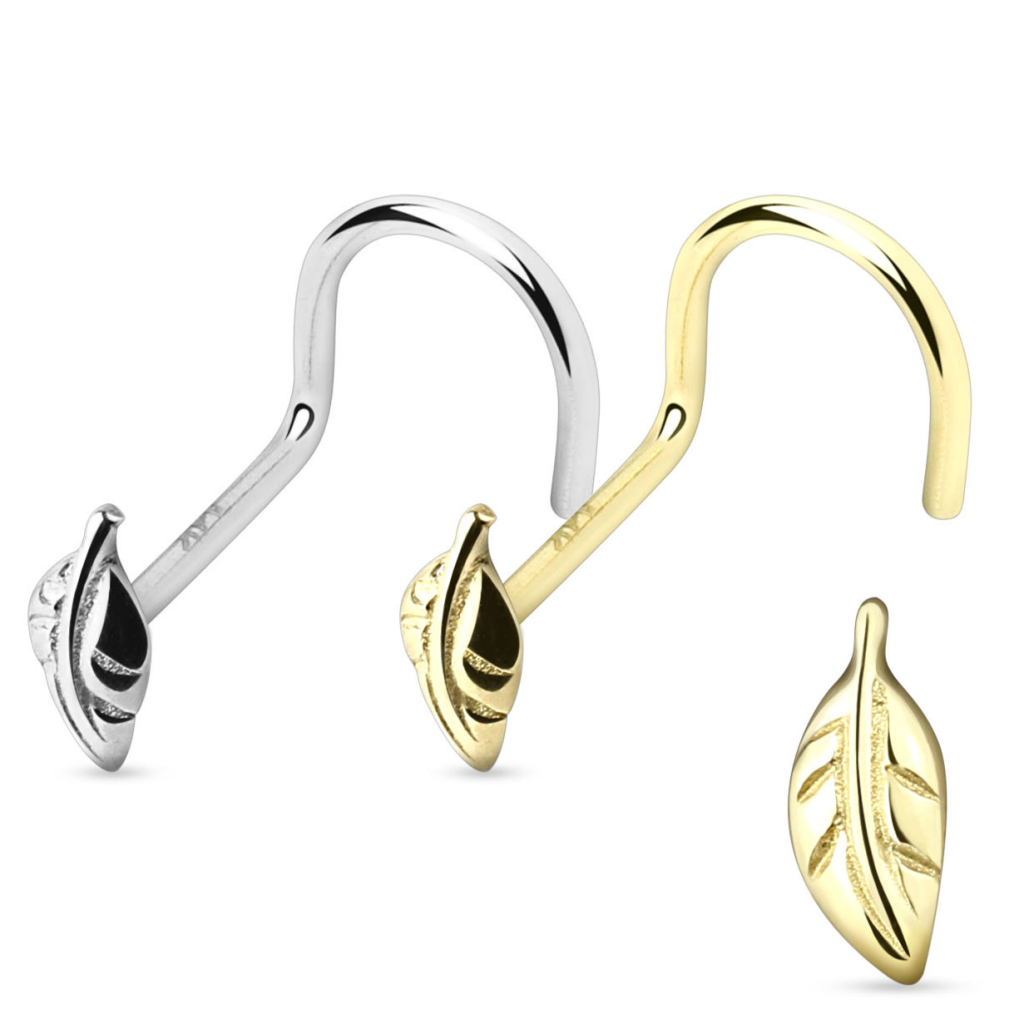Her har du mulighed for at få fingrene i en virkelig smuk og feminin næseskrue af 14 karat guld med blad på fronten. Det lille blad buer svagt i både stilk og facon og imiterer dermed et ægte blad rigtig godt. Bladet af det pureste guld er 6,7 mm. højt og 2,7 mm. bredt og er designet så man kan se strukturerne af årerne på begge sider. Det er et yderst naturtro design som i formen godt kan lede tankerne hen på den stolte bøg med sine karakteriske lysegrønne blade.