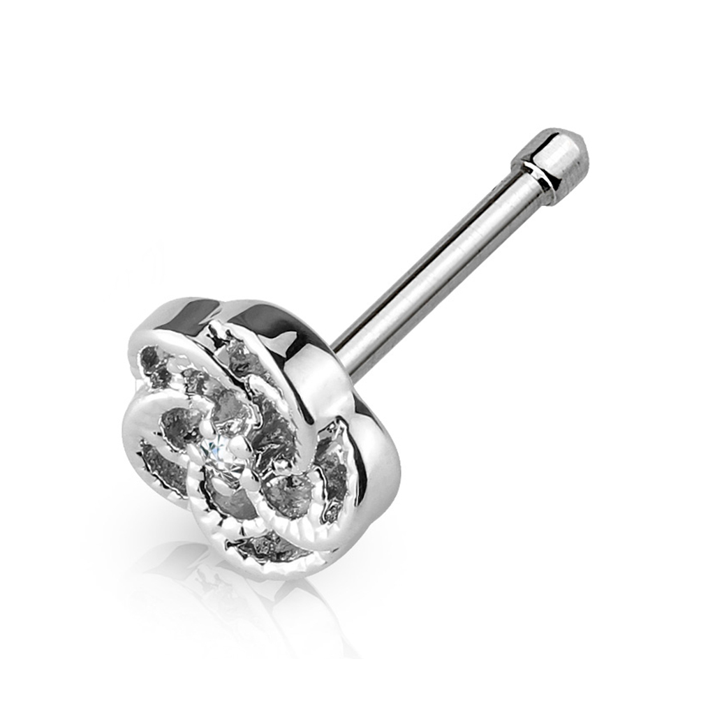 Denne søde næsestav består af en lige stav med en smuk rose i fronten. Rosen er meget detaljeret med hullede overlappende blade, der tilmed har fået lidt struktur i form af små knopper på bladenes kanter. I midten af rosen er der monteret en lille sten, som matcher det spejlblanke design rigtig godt.