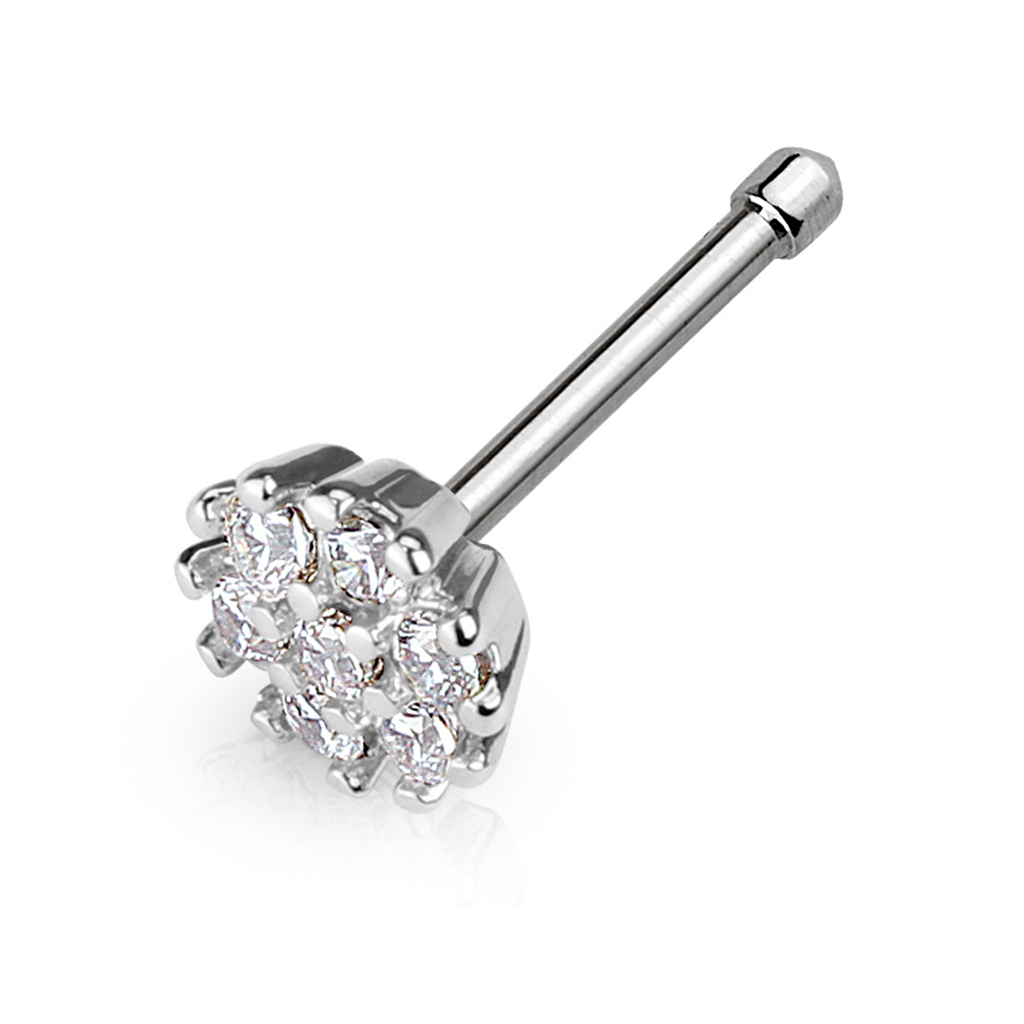 Denne næsestav er til dig der går efter det feminine look, men samtidig ikke ønsker noget der ikke kan ses. Smykket her er en anelse større end andre smykker, faktisk måler det hele 6 mm. i diameter. Men til gengæld er det fyldt med små klare sten, som skal forestille bladene på en blomst. det kan dog godt være svært at adskille stenene fra resten af blomsten, da det sepjlblanke materiale og de krystalklare sten falder i ét med hinanden. Men det er netop det der gør smykket feminint.