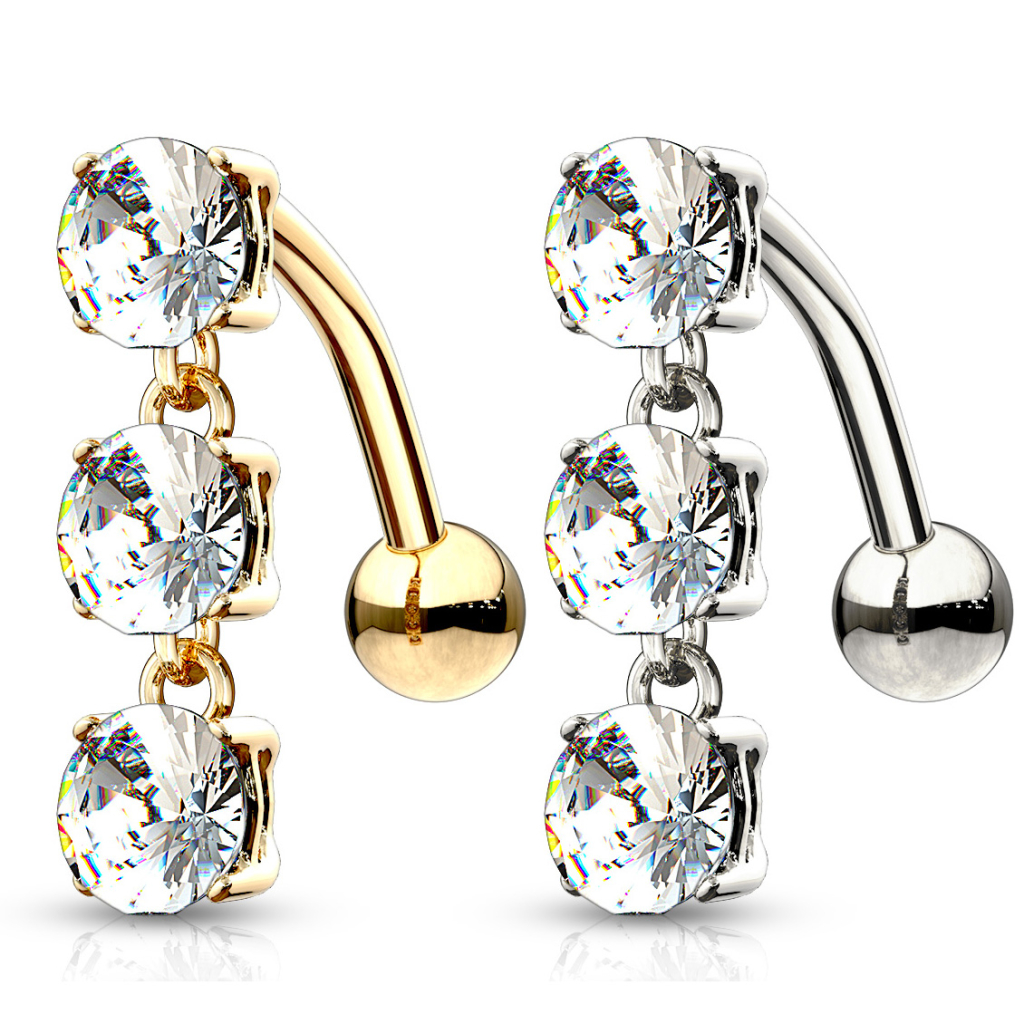 Navn: Navlepiercing af 14 karat guld med omvendt vedhæng og tre sten