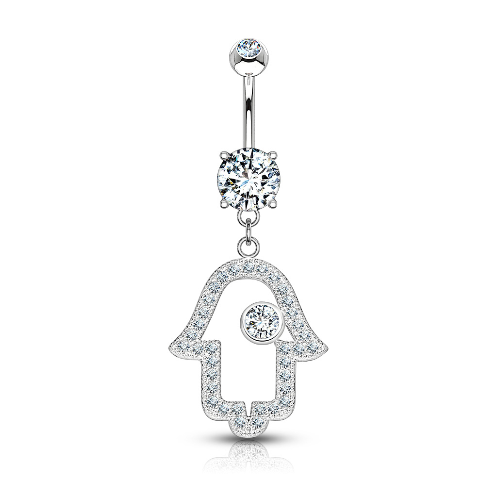 Navn: Navlepiercing af 14 karat guld med stenbesat hamsahånd