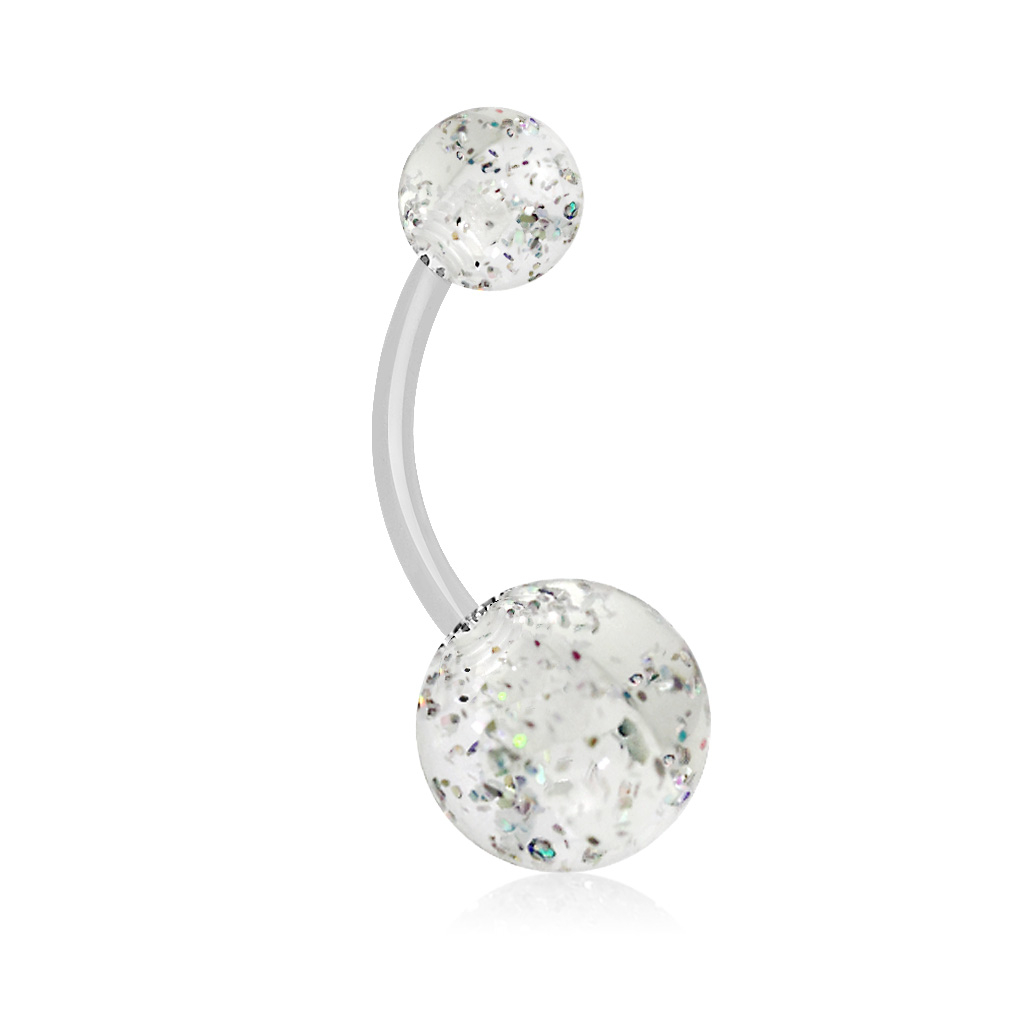 Denne navlepiercing er lavet af akryl, som gør den blød og behagelig at bære. Kuglerne på dette piercingsmykke er gennemsigtige og fyldt med glitterflager, som giver den sit unikke look.