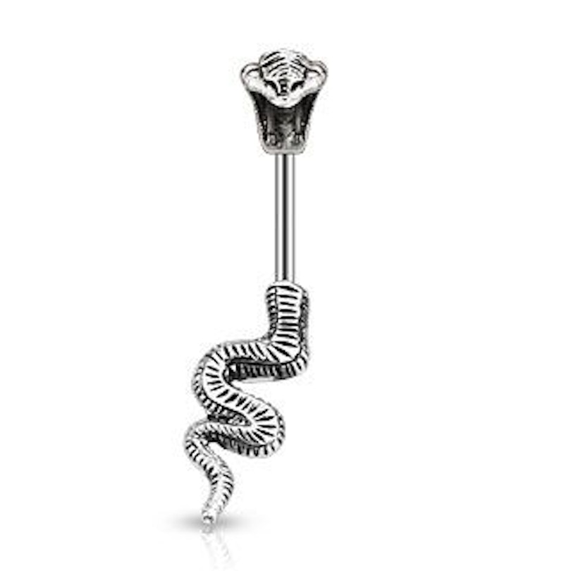 Er du også mere til de lidt frække og kække navlepiercinger, som ikke oser langt væk af lyserøde prinsesser? Så tjek lige denne super fede navlepiercing med en kobraslange ud. Den flotte kobra er meget detaljeret udført med det hvislende hoved let foroverbøjet, samt med de karakteristiske brede kanter ned langs siden af hovedet. Hovedet sidder over navlen i den ene ende af staven, mens den bugtende slangekrop sidder i den anden ende af staven, under navlen.