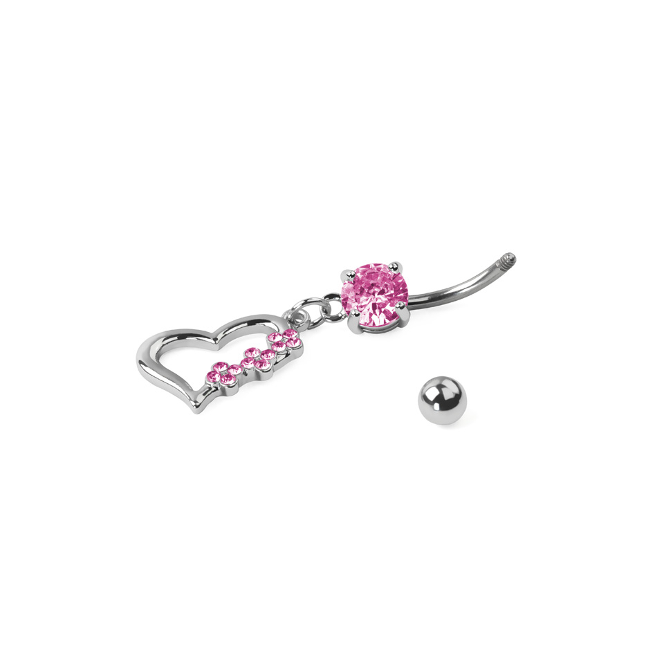 Smukt udført navlepiercing som er designet i et flot udtryksfuldt design med en glimtende sten og et flot hjerte med små farvede sten som vedhæng. Smykket fås i tre forskellife farver, du vælger blot din foretrukne farve før du går videre til bestlling.