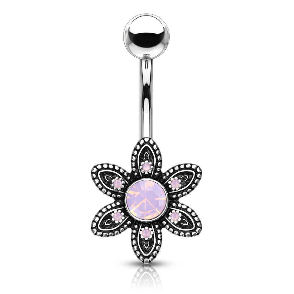 Navlepiercing med blomst og runde sten af opalite