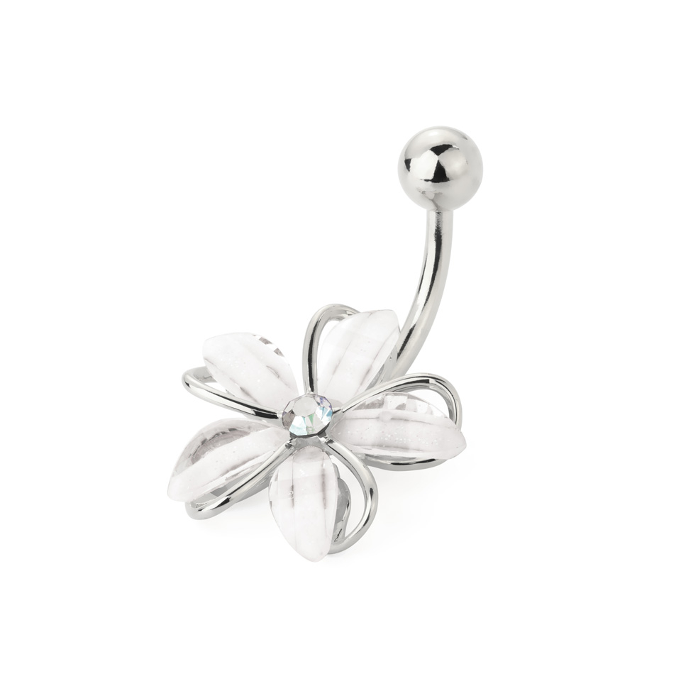 Leder du efter et smart smykke til din stil? Denne navlepiercing har en detaljeret blomst i bunden og en simpel låsekugle i toppen. Du kan vælge mellem 3 stilrene farver alt efter hvilken der matcher din stil bedst.