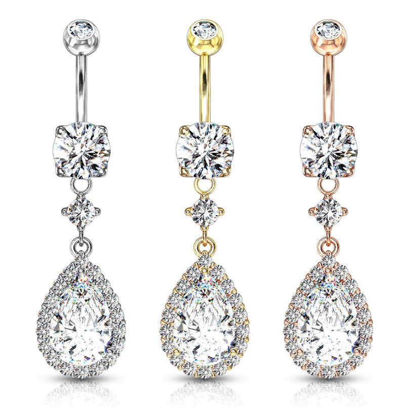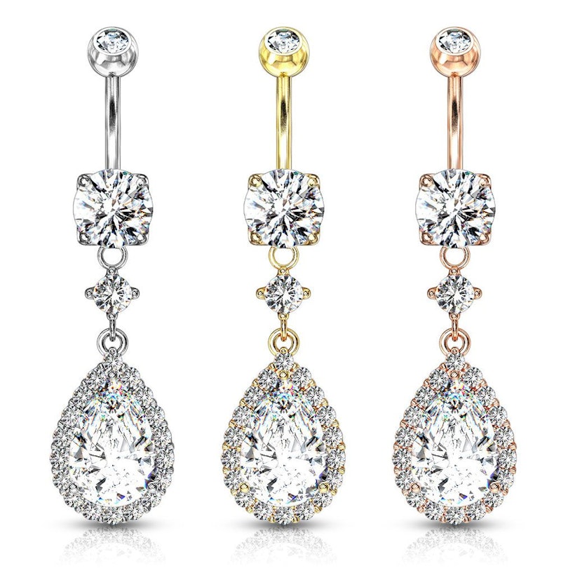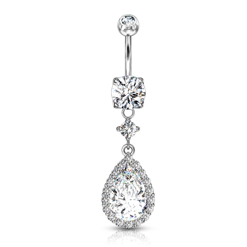 Navlepiercingen du ser her, er udstyret med en stor dråbeformet sten i vedhænget. Stenen har rundtom sig, endnu en masse små klare sten, som sidder som en funklende kant hele vejen rundt. Over dråben er endnu en lille sten, som samtidig fungerer som et bindeled mellem bundkuglen og dråben.