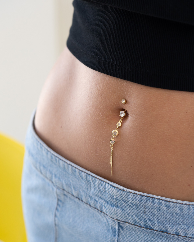 Mangler du et simpel og elegant piercingsmykke til din navlepiercing - Så er her et godt bud på hvordan sådan et kan se ud. Navlepiercingen har en stor flot klar sten i den øverste stav og tre små skriver som vedhæng, alle med deres egen smukke sten i midten. Sidst men ikke mindst, er der også tre skinnende tråde i bunden, som gør denne navlepiercing til et elegant, men også tydeligt piercingsmykke.