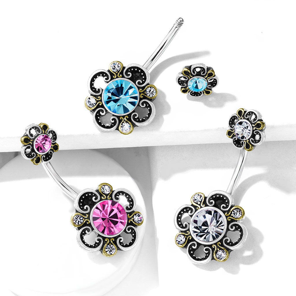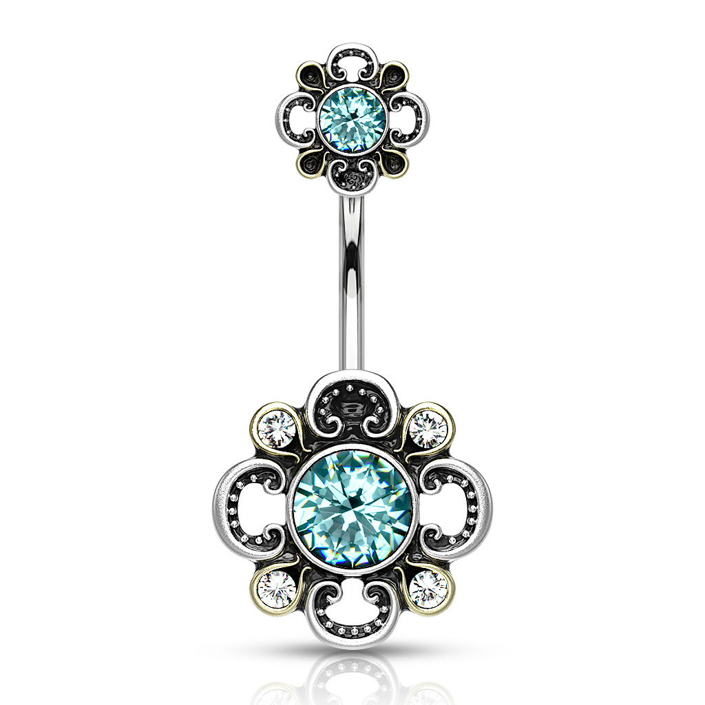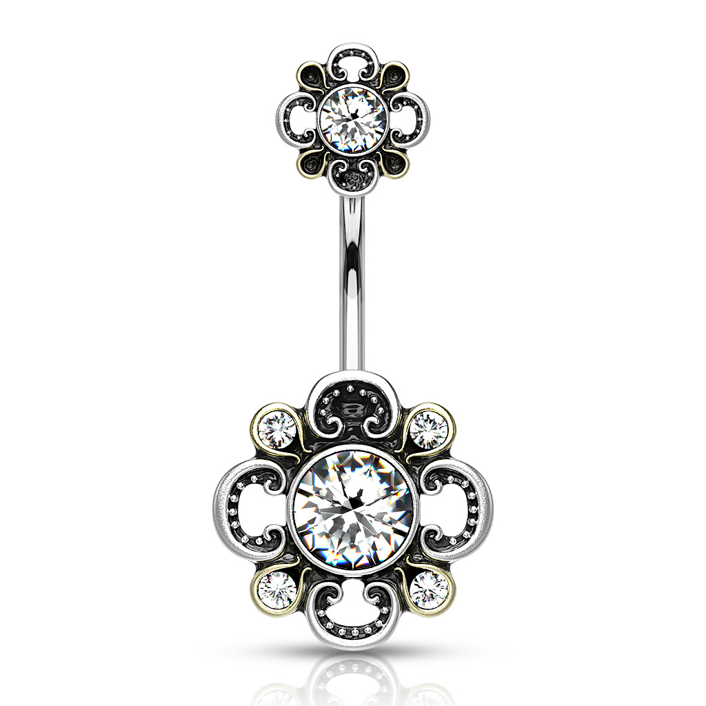 Navlepiercing med filigranblomst med udstansede blade og sten
