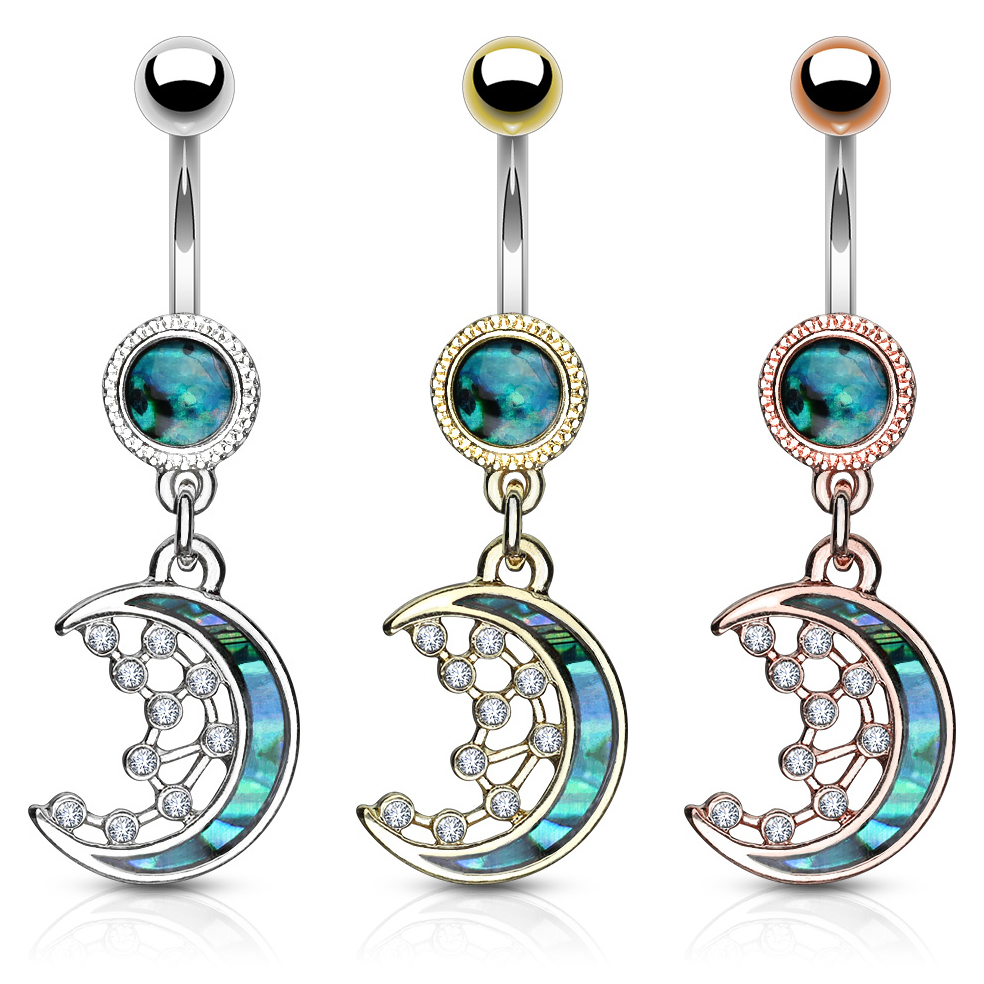 På billedet ovenfor ser du en af de lidt mere mystiske navlepiercinger. Smykket her er fyldt med betydninger og symbolikker fra forskellige troer rundt omkring i verdenen. På smykket hænger der en halvmåne med nogle stjerne. En halvmåne betyder f.eks i den keltiske tro vækst og kreativitet. Månen, såvel som bundkuglen er blevet dekoreret med perlemor, som eftersigende skulle have en beroligende effekt på den, som bærer det. Perlemor er det naturmateriale, som det indre lag af en perlemusling består af - dette materiale bliver ofte brugt i forbindelse med smykkefremstilling.