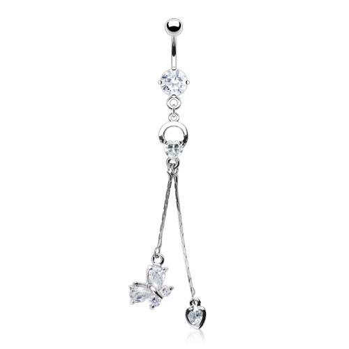 En virkelig udsøgt navlepiercing med lange kæder og smukke motiver af klare sten. Vedhænget som er super gennemført i sit design, starter med en lille ring der er dekoreret med et hjerte af klar sten allernederst. Under dette hjerte sidder der endnu en ring, som de to lange kæder er hægtet fast på, uafhængigt af hinanden. Kæderne sidder altså ikke sammen og kan derfor begge bevæge sig frit i takt med din krops bevægelser.