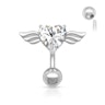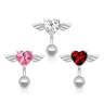 Nu kan du få det flotte motiv som mange kender som et af de mest populære tatoveringsmotiver, som navlepiercing. Det er det velkendte lille hjerte med vinger på hver sin side der her er tale om. Selve smykket er lavet af kirurgisk stål som er det mest brugte materialer til piercingsmykker, fordi det ikke frigiver nikkel. Hjertet består af en flot facetskåret sten, som du selv kan vælge i en af de tre smukke farver.