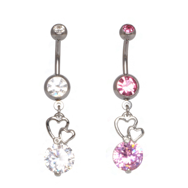 Uanset hvilken farve du vælger, får du en smuk navlepiercing med to søde hjerter i vedhænget, to kugler med sten i selve navlesmykket og en stor sten bunden af det søde vedhæng.