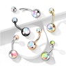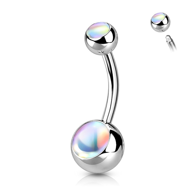 Du kender det fra sæbebobler, eller når du ser olie i vand. Den stærkt glinsende overflade der skifter farve når emnet bevæger sig. Det kan være fascinerende at kigge på. Det samme gør sig gældende ved dette navlesmykke. Stenene i top- og bundkuglen skifter farve som benzin på en vandoverflade. Da billedet er et stillestående billede, kan det ikke vises. Det kræver at man ser smykket foran sig og drejer det fra side til side. Bærer du derfor smykket synligt i navlen, vil man kunne se det når du bevæger dig.