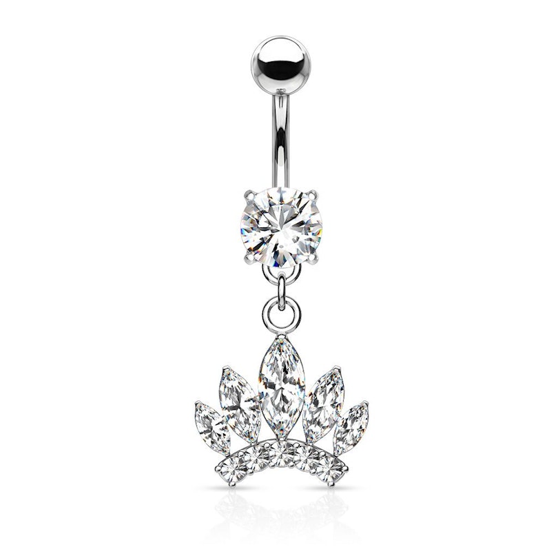 Bliv prinsesse for en dag eller måske endnu længere, med denne super søde navlepiercing med krone af sten i vedhænget. Den ultra feminine prinsessekrone er lavet helt i sten og består af fem aflange sten øverst, hvor den midterste sten er størst mens de andre bliver proportionelt mindre jo længere men kommer ud. Under de fem aflange sten, sidder et "bånd" af små runde sten der agerer "bund" i den smukke krone.