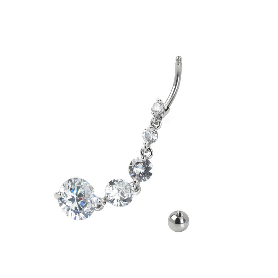 Navlepiercingens stav er 10 mm. lang og er lavet af det sikre og mest almindelige smykkemateriale, kirurgisk stål. På toppen af staven sidder en helt almindelig topkugle. I bunden af staven har vi det lange flotte vedhæng, hvor du selv bestemmer farven på stenene.