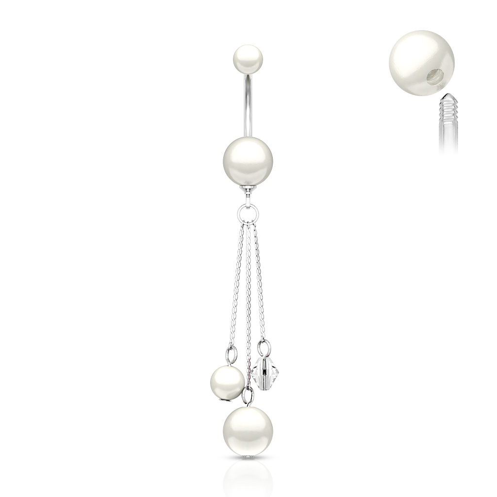 Sød navlering af kirurgisk stål med kugler af akryl, der ligner rigtige perler, i klassiske kædevedhæng. Ned fra bundkuglen hænger tre kæder i forskellige længder i et asymmetrisk design. En af kuglerne er diamantformet, men alle kuglerne har samme farve.