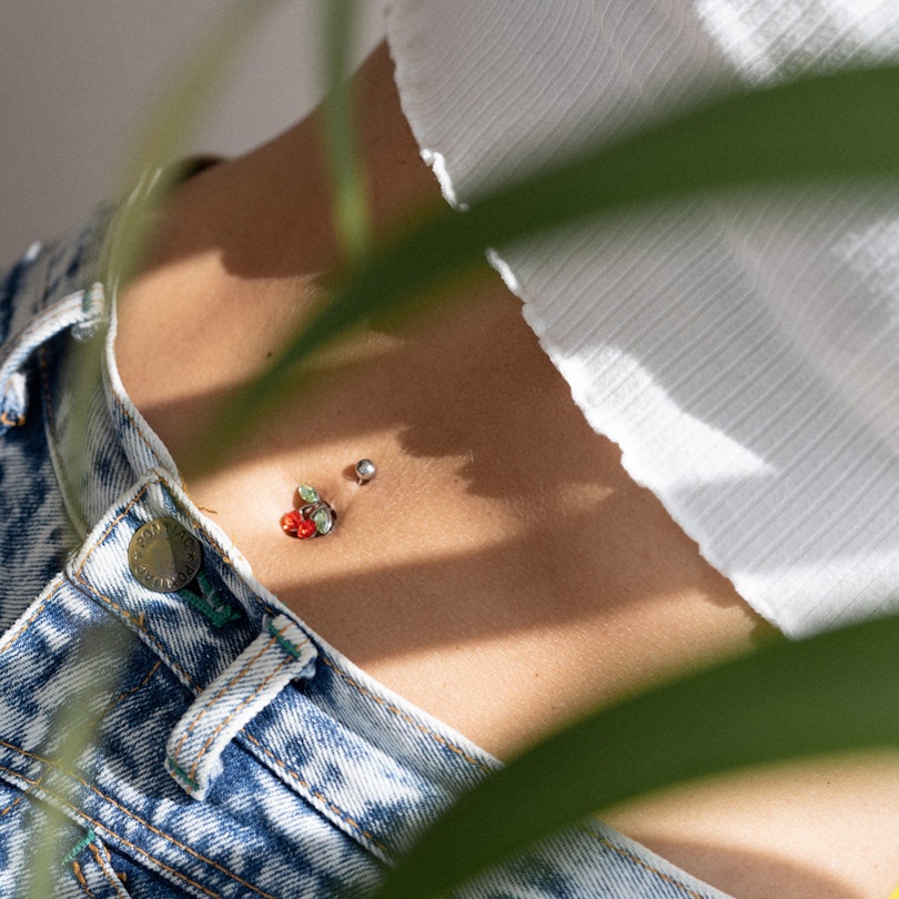Smykket her er helt uden løse vedhæng, de flotte røde bær træder ganske enkelt i bundkuglens sted. Det gør denne navlepiercing yderst velegnet til daglig brug, når der ikke er lange løse vedhæng som kan risikere at hænge fast i tøjet.