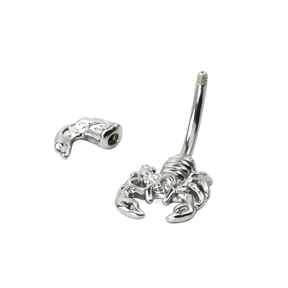 Det er en navlepiercing helt uden vedhæng eller andre løse dele og den egner sig dermed rigtig godt til daglig brug. Den flotte skorpion er meget detaljeret udført og består af to dele som tilsammen udgør det kraftfulde lille dyr. I stedet for en traditionel bundkugle har du hele dyrets front med krop, ben, klør, følehorn og hoved, i bundkuglens sted. Designet er som sagt meget detaljeret og der ses endda riller på ryggen af skorpionens krop.