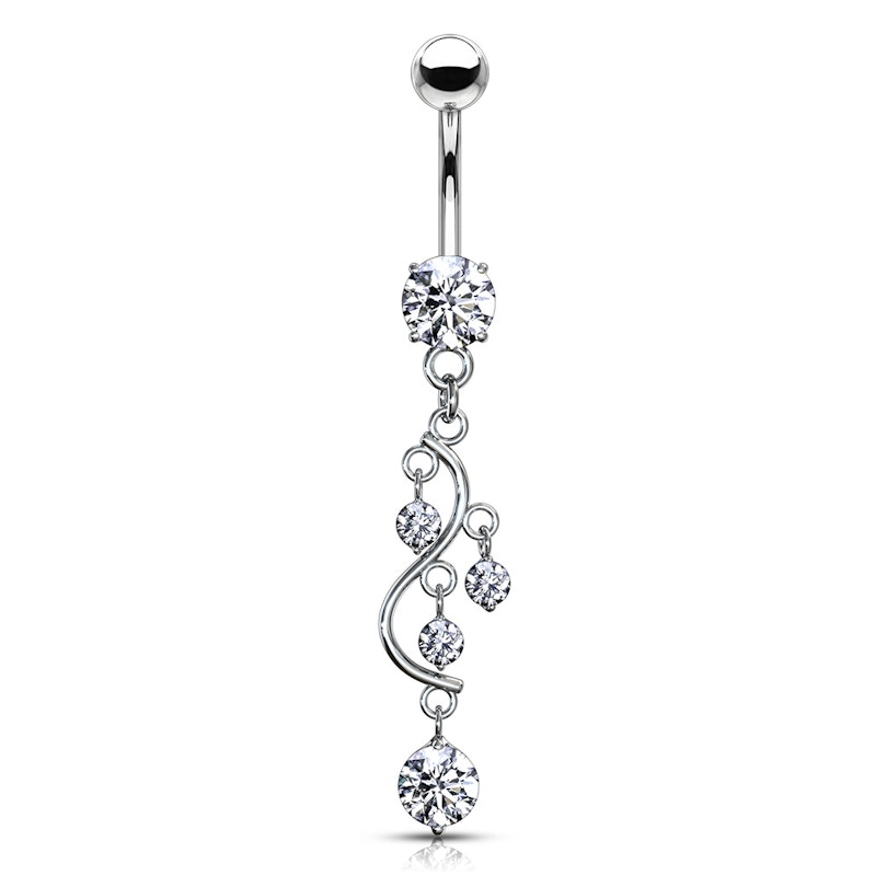Denne navlepiercing er både smuk og elegant med sit lange slanke design og passer perfekt til dig som gerne vil have en navlepiercing der både bliver set og lagt mærke til. Materialet er ægte kirurgisk stål som ikke frigiver nikkel og som derfor er et både allergivenligt, men samtidig også et prisvenligt materiale.