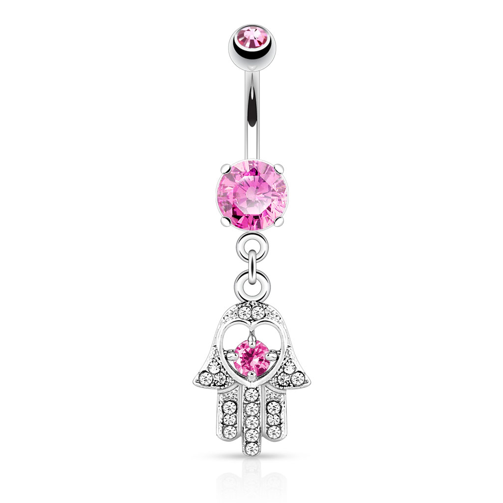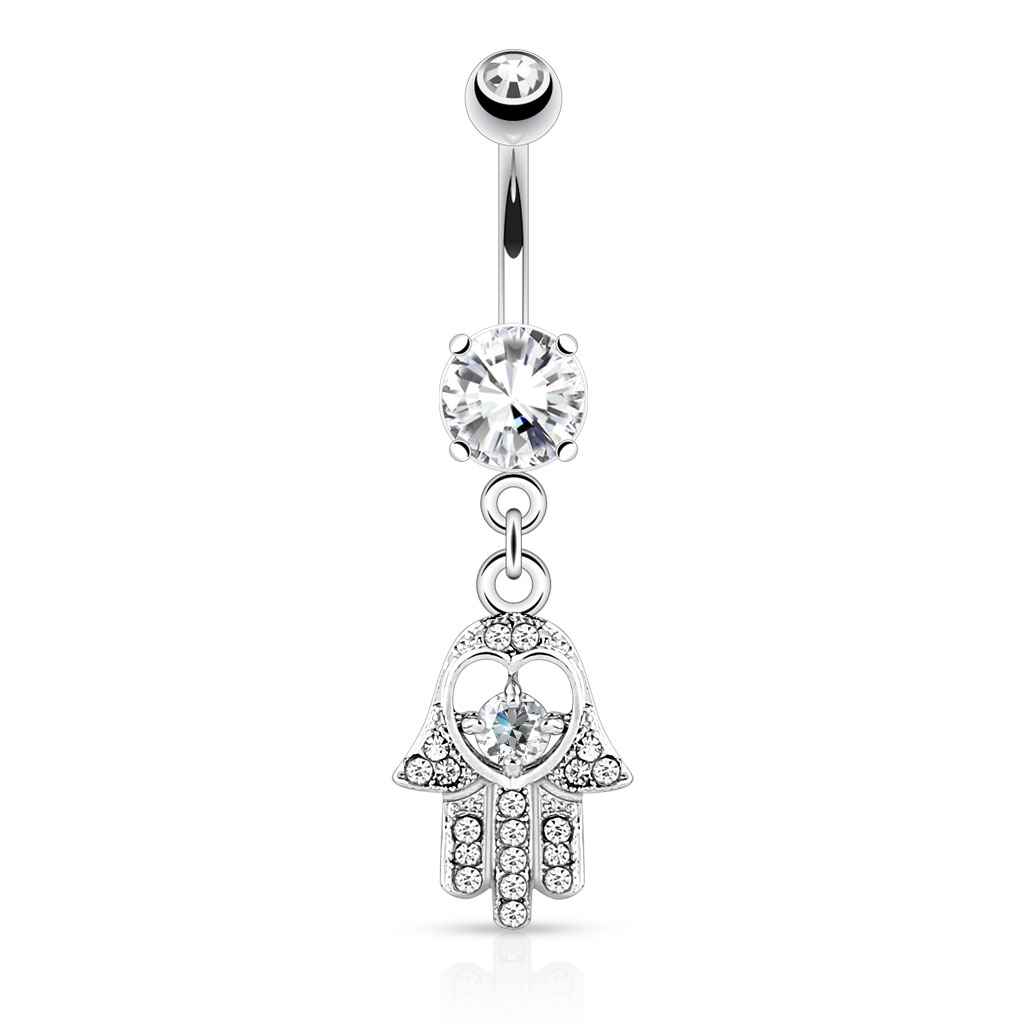 Her kan du erhverve dig en rigtig flot navlepiercing med hamsahånd i vedhænget. Hamsahånden er et ældgammelt symbol fra Mellemøsten hvor det blev betragtet som en beskyttende amulet, for den som bar det på sin krop. Af samme grund blev hamsahånden også hurtigt et populært motiv til smykker.