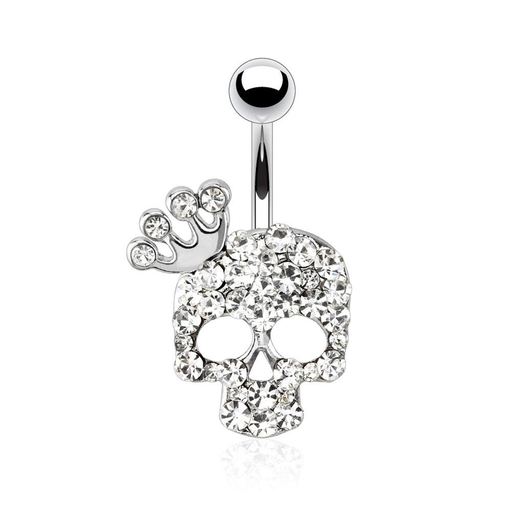 En virkelig sød navlepiercing med et stenbesat skull der glitrer og glimter som en hel håndfuld diamanter. De mange klare sten sidder helt tæt sammen så de fylder hele dødningehovedet ud, på nær de tre huller der er lavet som øjne og næse selvfølgelig. Øjnene er lavet som to store tomme øjenhuler mens næsen er markeret som en lille trekant lige midt i mellem og lidt under de to runde øjne.