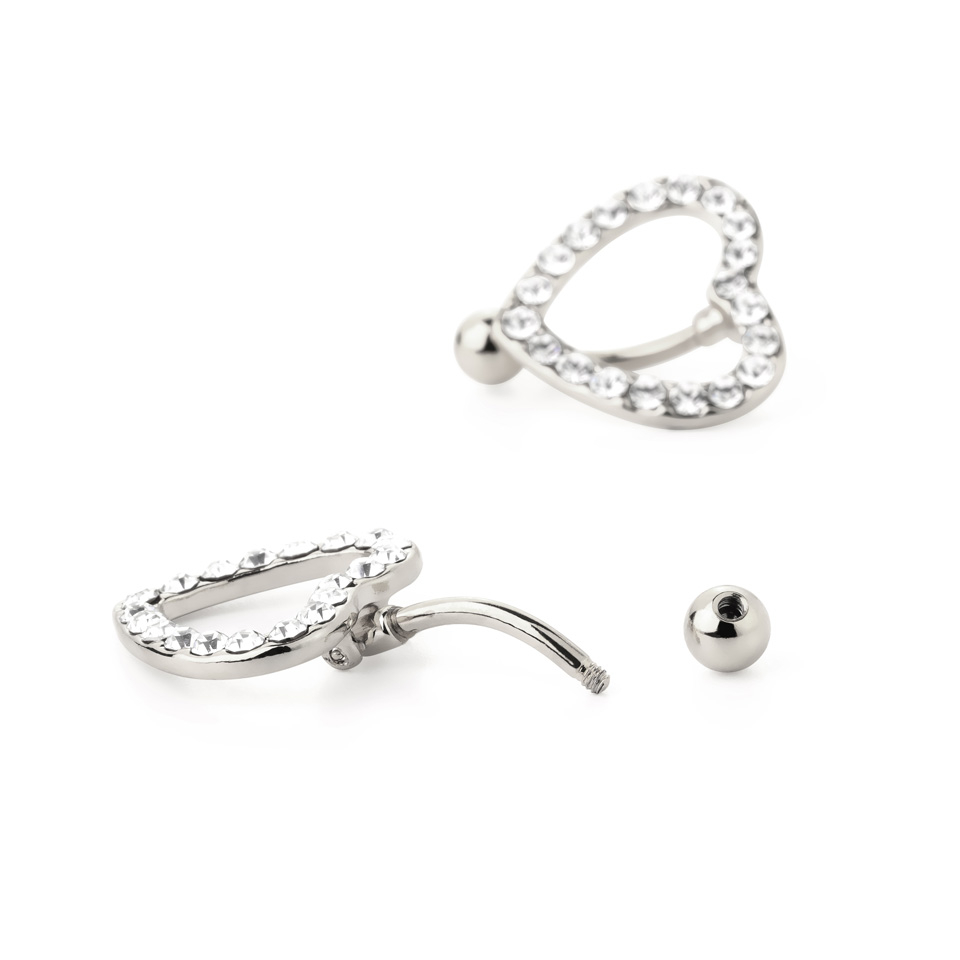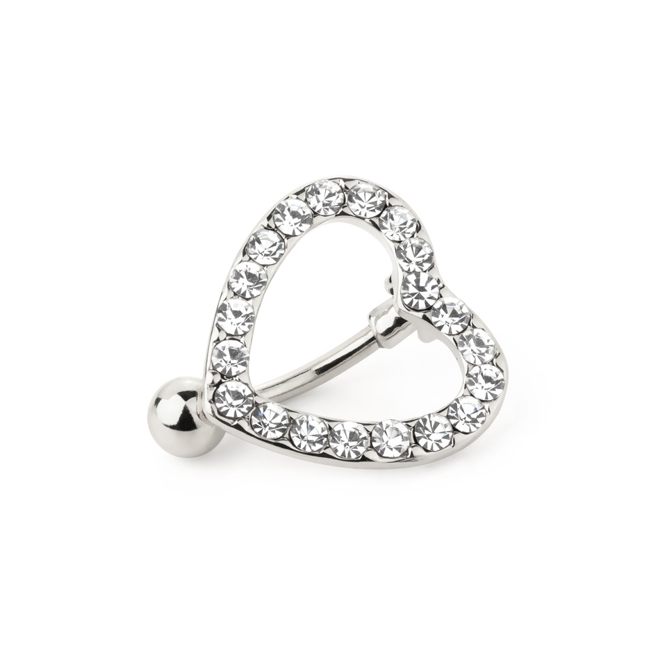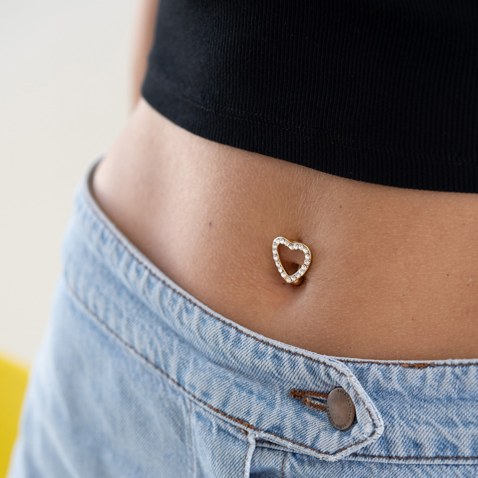 Navlepiercingen her er lavet af kirurgisk stål er er konstrueret således at det store hjerte kan "vippes" til at sidde rigtigt. så det flugter med huden på en pæn måde. Det store hjerte er tæt besat af en hel masse små glimtende sten, der sidder placeret inde i selve hjerterammen. Hver sten sidder fast med små fangarme som holder dem godt på plads.