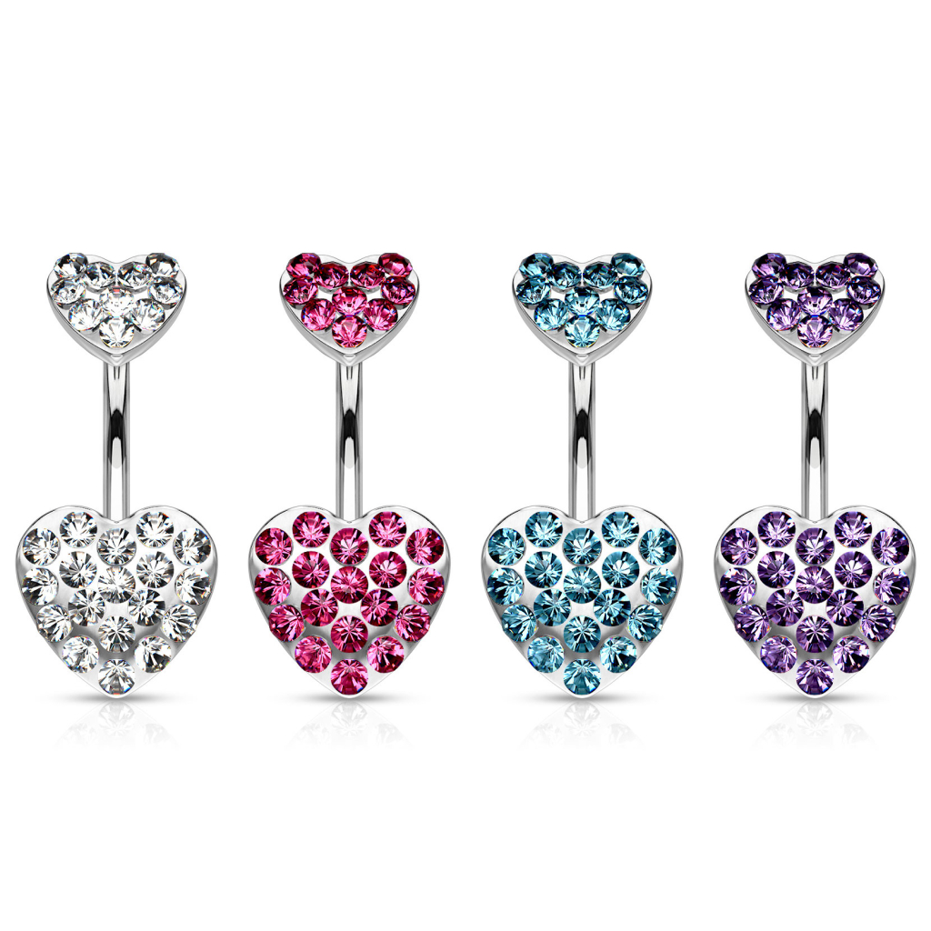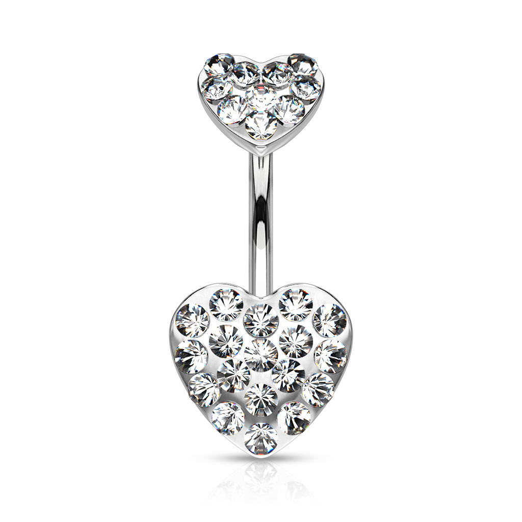 Smykket her er lavet af kirurgisk stål og har en 10 mm. lang stav. Men i stedet for en almindelig top- og bundkugle, er der brugt to søde hjerter der er så tæt besat med sten, at det faktisk er det eneste man kan se. De mange små sten er alle facétskårede, hvilket bevirker at de reflekterer lyset fra alle vinkler og derfor funkler og skinner ekstra meget. Du kan vælge mellem hele fem friske farver sten til dine hjerter i denne navlepiercing, alle er lige flotte men der er sikkert en som falder mere i din smag end de andre.
