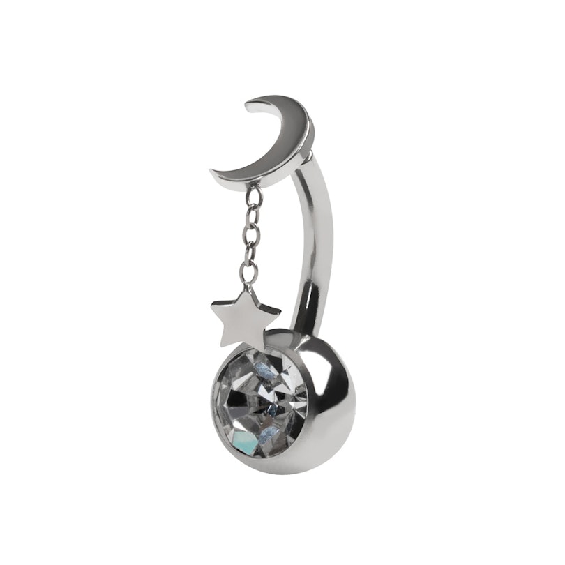 Denne titaniumnavlering er pyntet med en måne og et stjernevedhæng på den øverste del, som i din piercing ser ud, som om de svæver. Den nederste kugle kan prale af en indfattet CZ-sten, der giver lidt ekstra gnister.