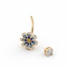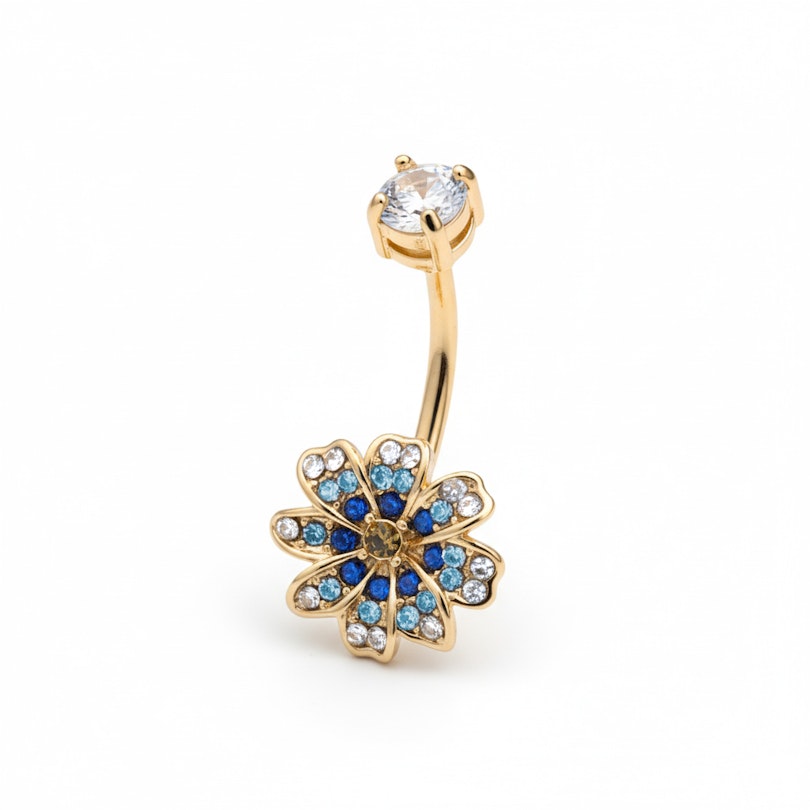Denne søde navlering med blå blomst er skabt til crop top-sæsonen. Blomsten er lavet med små sten i forskellige nuancer af blå og en gul sten i midten. Topkuglen har en klar sten.