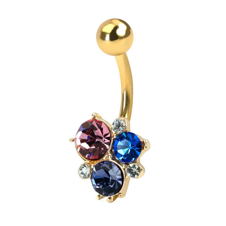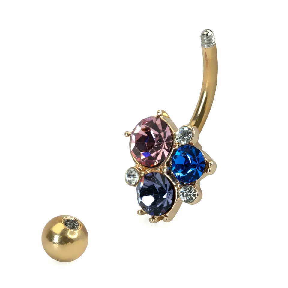 Navlering af kirurgisk stål med en topkugle på 5 mm og forneden en klase af forskelligt farvede krystaller sat fast med tænder.