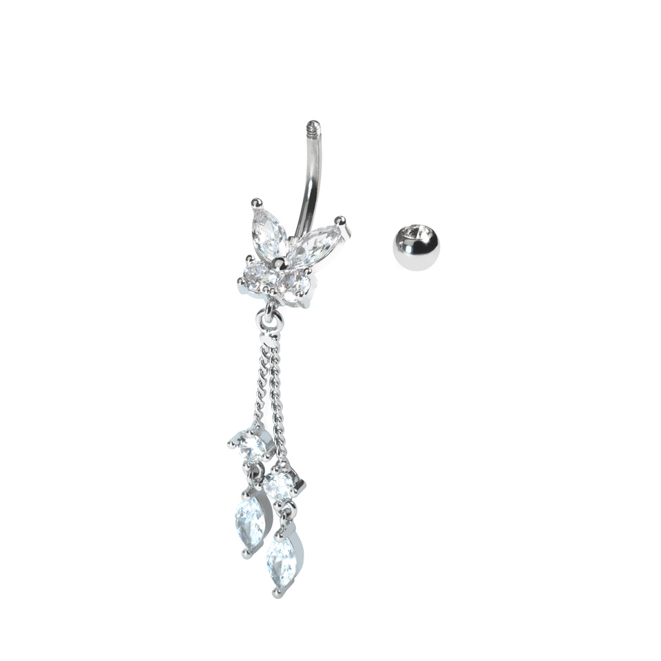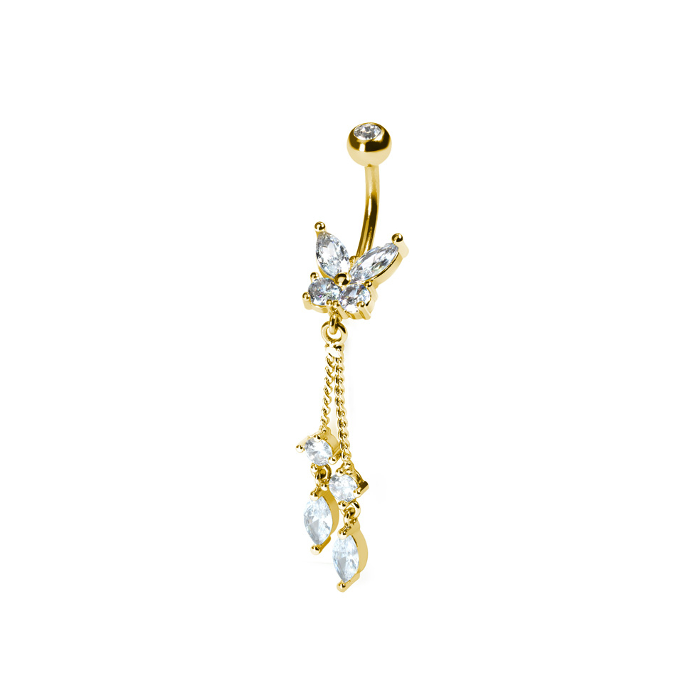 Denne glitrende navlering har en smuk sommerfugl på bundkuglen og endnu flere funklende sten i de vedhæng, der hænger ned fra sommerfuglen i fine kæder.