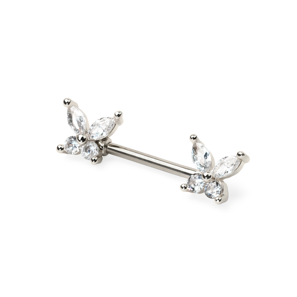 Det er et statement piece, der viser klasse og modesans, et must-have i din samling. Hver vinge af hver sommerfugl er besat med zirconia-sten, der gør det ellers meget søde nipple-smykke mere sofistikeret.