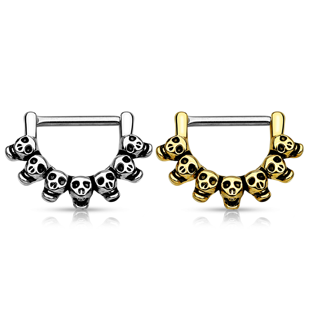 Selve smykkets design, minder om noget fra Mexico, hvor de årligt fejrer de døde med én stor fest. For det er nemlig hvad dette smykke er, en stor fest af syv små søde skulls, som sidder flot og symmetrisk på en let buet række under brystvorten. Du vælger selv om du vil modtage smykket i en blank udgave eller en flot gylden udgave med en let mørkt baggrund.