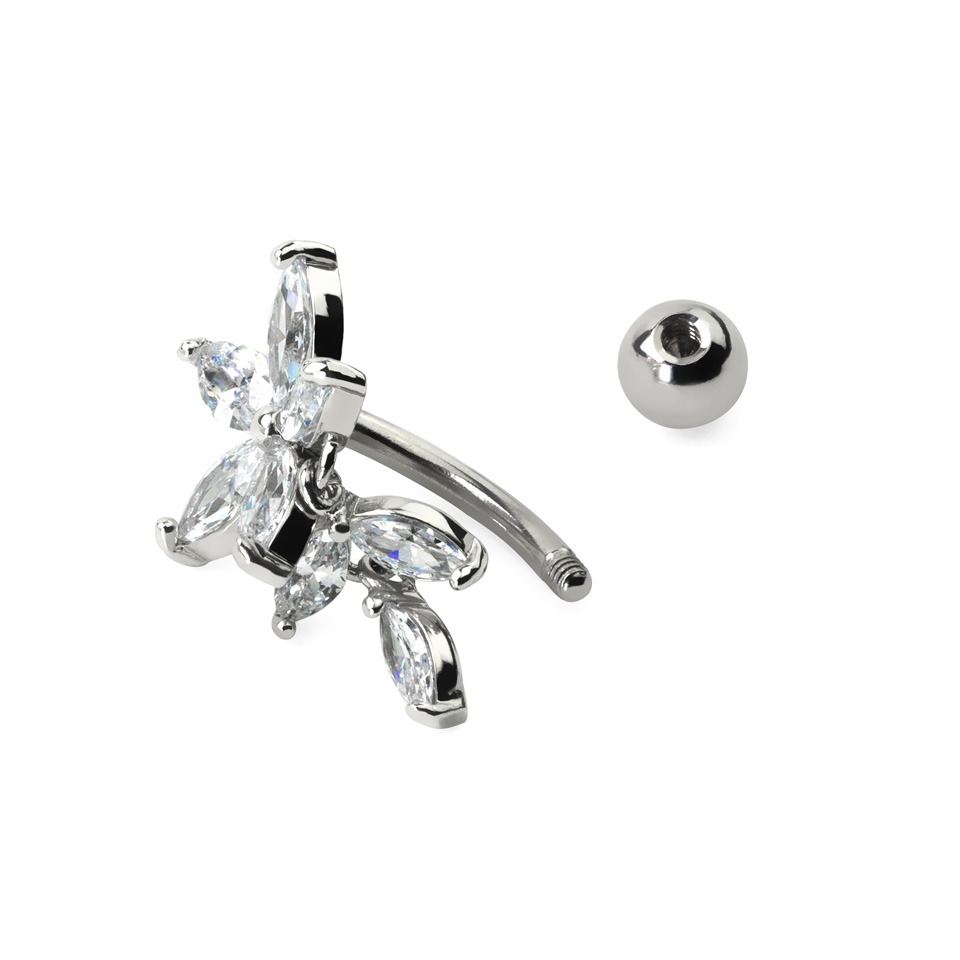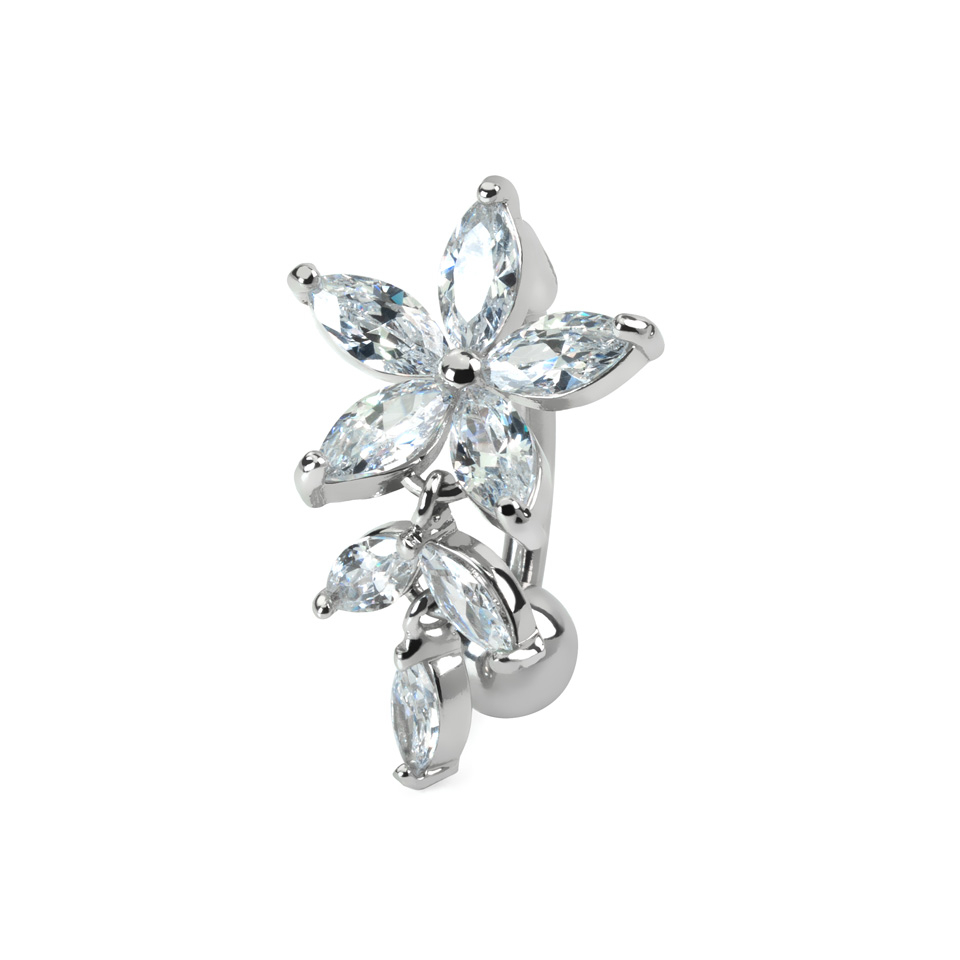 På dette smykke sidder vedhænget i toppen af smykket, hvor det normalt vil sidde i bunden. Det giver umiddelbart også mest mening at sætte det i bunden pga. tyngdekræften. Men i dette tilfælde vil blomsterranken skyde fra toppen af navlen og dække både navle og bundkugle, så det rent faktisk kun er selve blomsterranken man kan se. Smykket er også perfekt til dig der er piercet i bunden af navlen, da blomsten så vil skyde ud fra navlen.