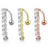 Smykket du ser på produktbilledet herover, består af en buet stav af kirurgisk stål. I bunden sidder det der normalt ville have været topkuglen, men da dette er en omvendt navlepiercing, er topkuglen dermed placeret i bunden og ikke i toppen. Til gengæld sidder vedhænget der normalt er placeret i bunden, nu i toppen. Det gør smykket ideelt til brug hvis du er piercet i den nederste del af navlen. Du kan dog også sagtens bruge den i en "normal" navlepiercing - Så vil stenene bare udspringe lige over navlen og dække over både stav, kugle og navle.