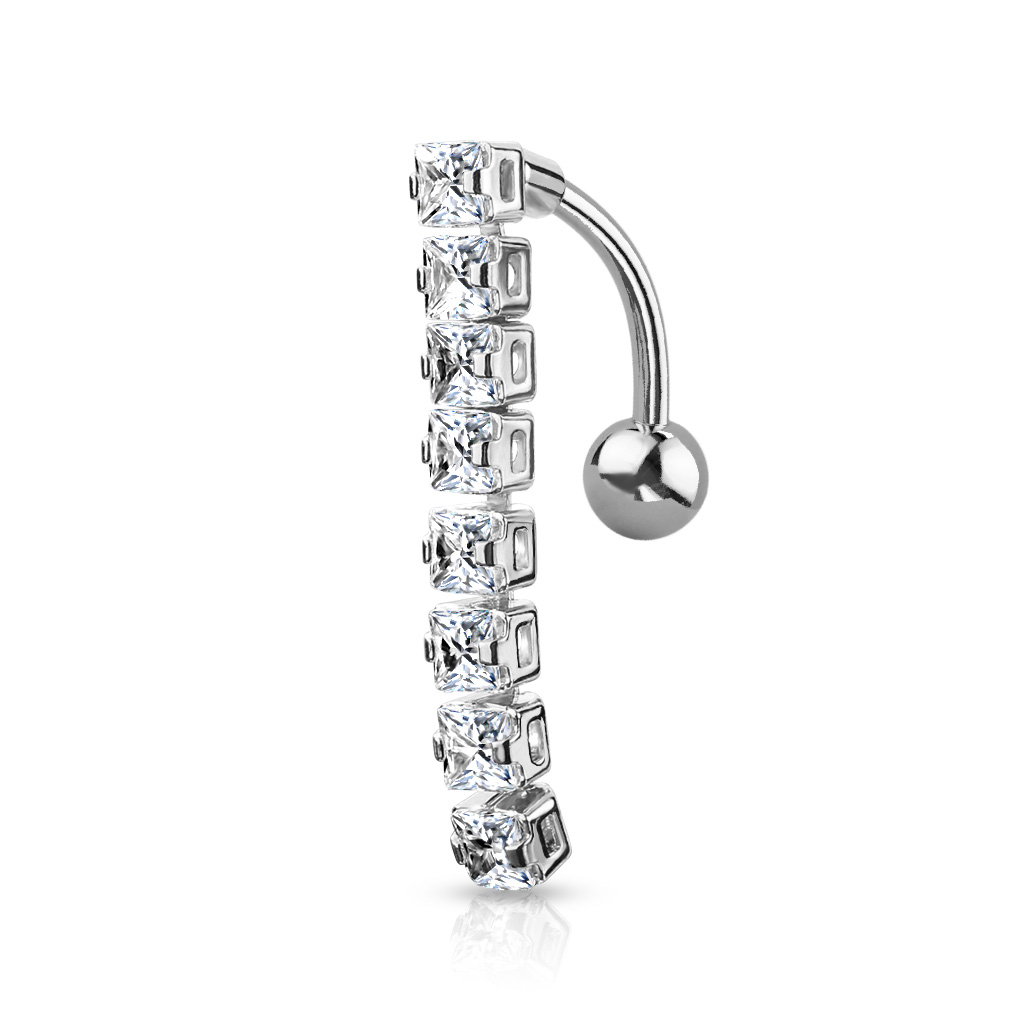 Smykket du ser på produktbilledet herover, består af en buet stav af kirurgisk stål. I bunden sidder det der normalt ville have været topkuglen, men da dette er en omvendt navlepiercing, er topkuglen dermed placeret i bunden og ikke i toppen. Til gengæld sidder vedhænget der normalt er placeret i bunden, nu i toppen. Det gør smykket ideelt til brug hvis du er piercet i den nederste del af navlen. Du kan dog også sagtens bruge den i en "normal" navlepiercing - Så vil stenene bare udspringe lige over navlen og dække over både stav, kugle og navle.
