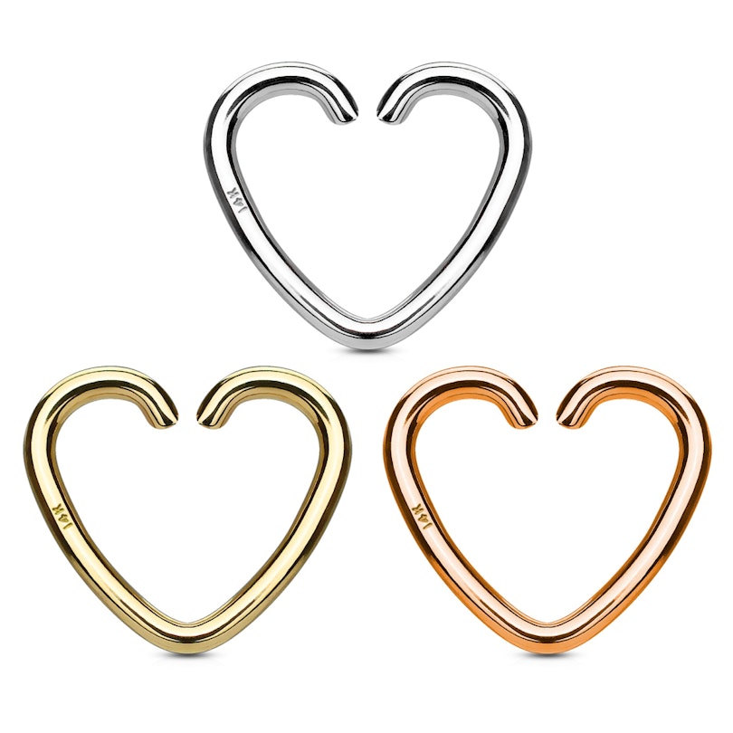 Hjertet kan købes i flere forskellige varianter, hvor du selv vælger hvilken type guld smykket skal have samt hvilken tykkelse der passer din piercing bedst. De indvendige mål på dette hjerte er 10 mm i bredden og 9 mm i højden. Alle varianter har samme mål lige bortset fra trådtykkelsen. Smykket gør sig derfor rigtig godt i de fleste ørepiercinger. Her kan f.eks. nævnes tragus, helix og daith som dette smykke egner sig bedst til.