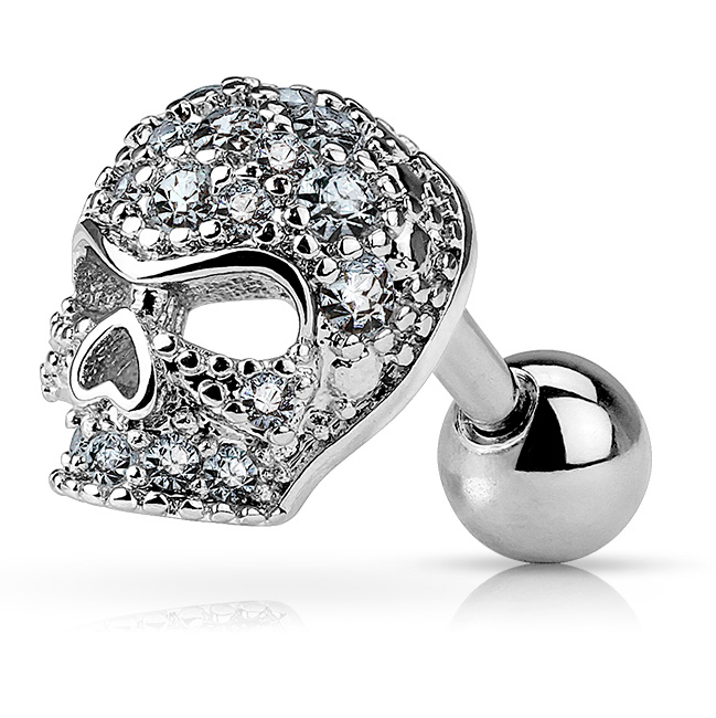 Superfedt skull monteret på en 6 mm stav med en 4 mm låsekugle bagpå. Brug smykket hvis du er piercet så et smykke med en trådtykkelse passer og hvor de oplyste mål også passer ind. Det kunne f.eks. være i tragus, i helix eller blot i øreflippen. Uanset hvor du placerer smykket, vil det se råt og rocket ud med dette stenbesatte skull.