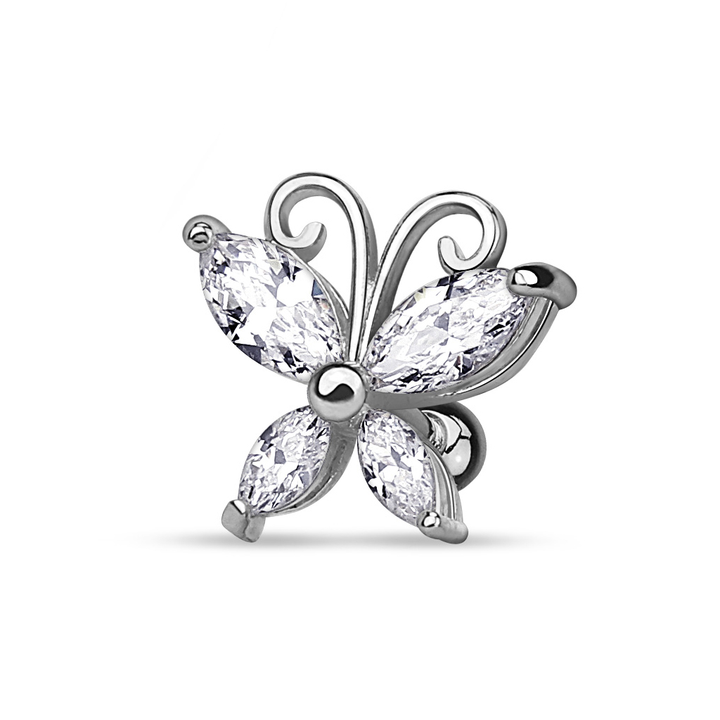 Det er svært ikke at elske motiver af søde florlette sommerfugle, og især når de er så smukt designet, som på denne skønne ørepiercing. Sommerfuglen på dette smykke, består af fire flotte vinger, som hver især, er lavet af en aflang klar sten. De øverste sæt vinger er lidt større end det nederste, hvilket giver en ret god og realistisk imitation, af en rigtig sommerfugl.