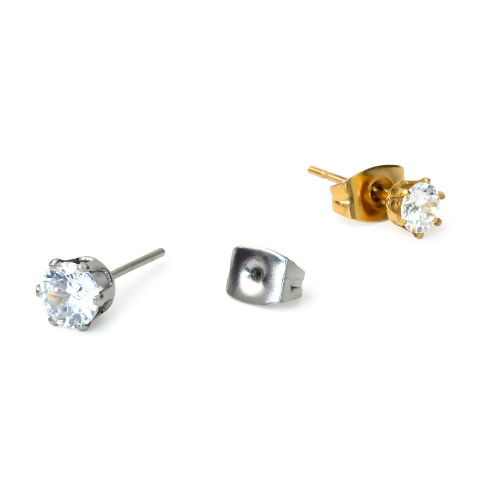 Ud over stenstørrelsen kan du også vælge mellem tre forskellige materialefarver, nemlig blank, sort eller guldfarvet. Alle tre modeller er lavet af kirurgisk stål men den sorte samt den guldfarvede model, har fået tilføjet en belægning som giver dem deres flotte karakteristiske farver.