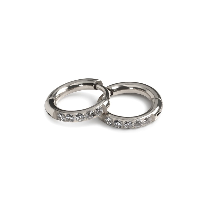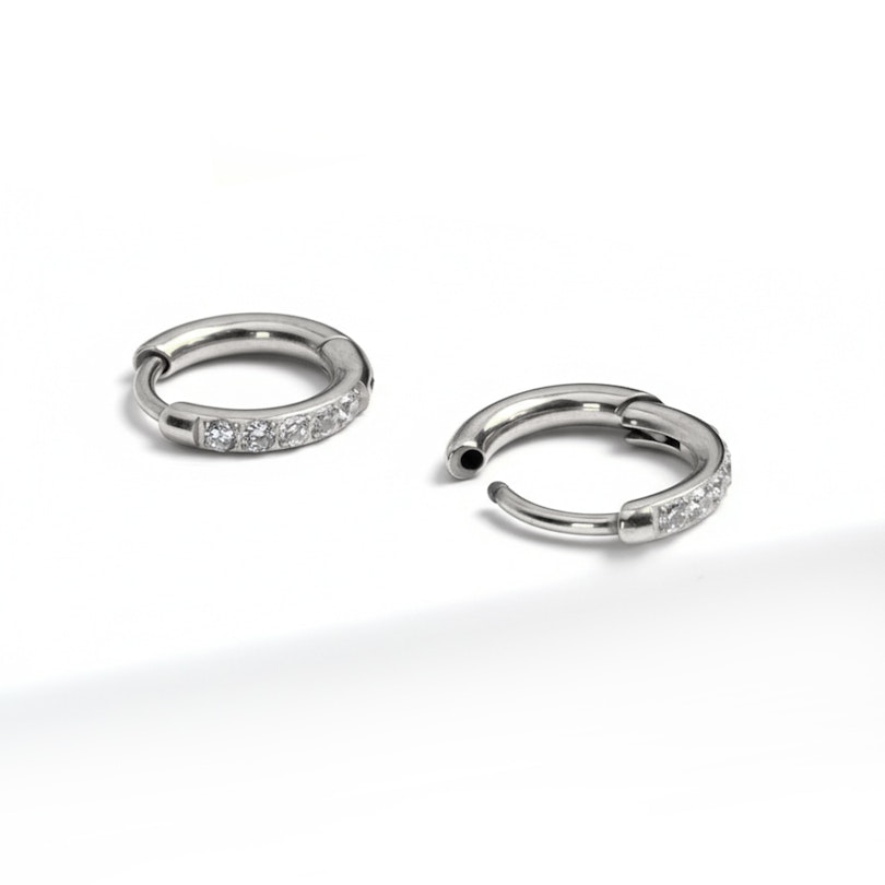 Opdag dit nye uundværlige look: førsteklasses titanium-huggies med sten af kubisk zirkonia. De er lavet af titanium i høj kvalitet, utroligt holdbare, helt allergivenlige og letvægtige for din komfort dagen lang. De glitrende sten af kubisk zirkonia giver en fortryllende gnist, og ringene er fuldkommen vandfaste, så du aldrig behøver tage dem af. De sælges som et par, der passer perfekt til både hverdag og luksus.